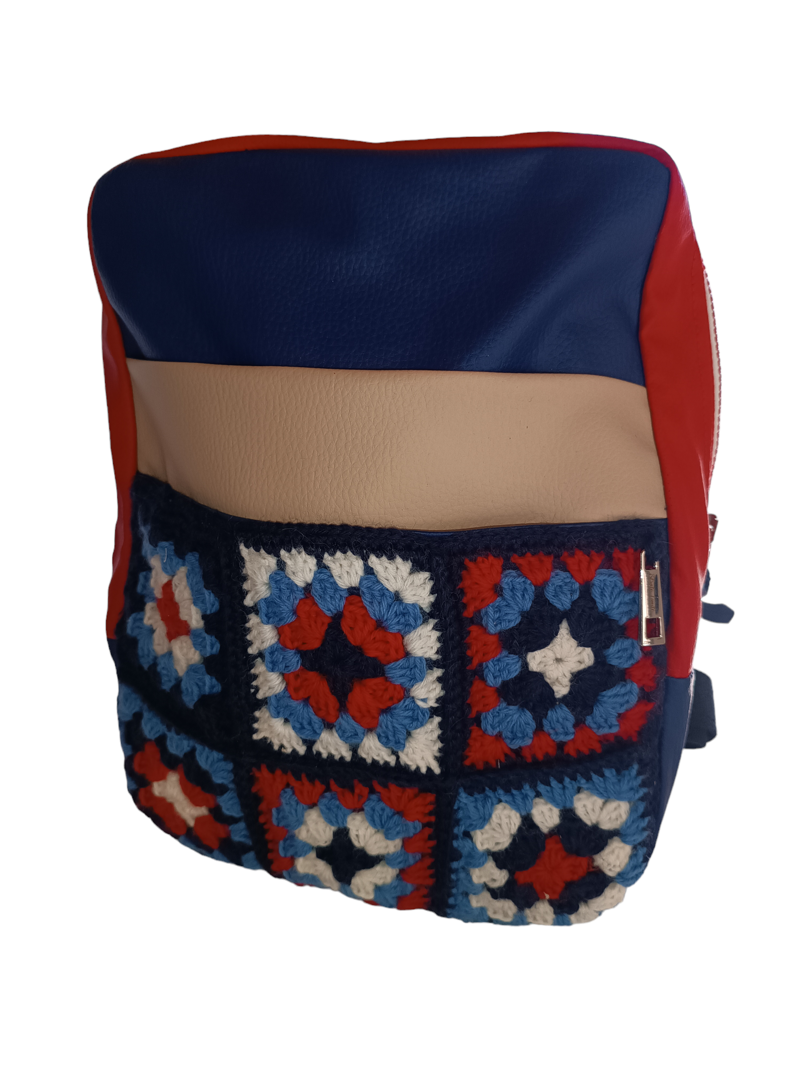 This vibrant and stylish backpack features colorful crochet patterns that make it a standout piece for any occasion. Its unique combination of red, blue, and beige panels offers a modern yet timeless appeal. Perfect for adding a touch of creativity and flair to your everyday look.
