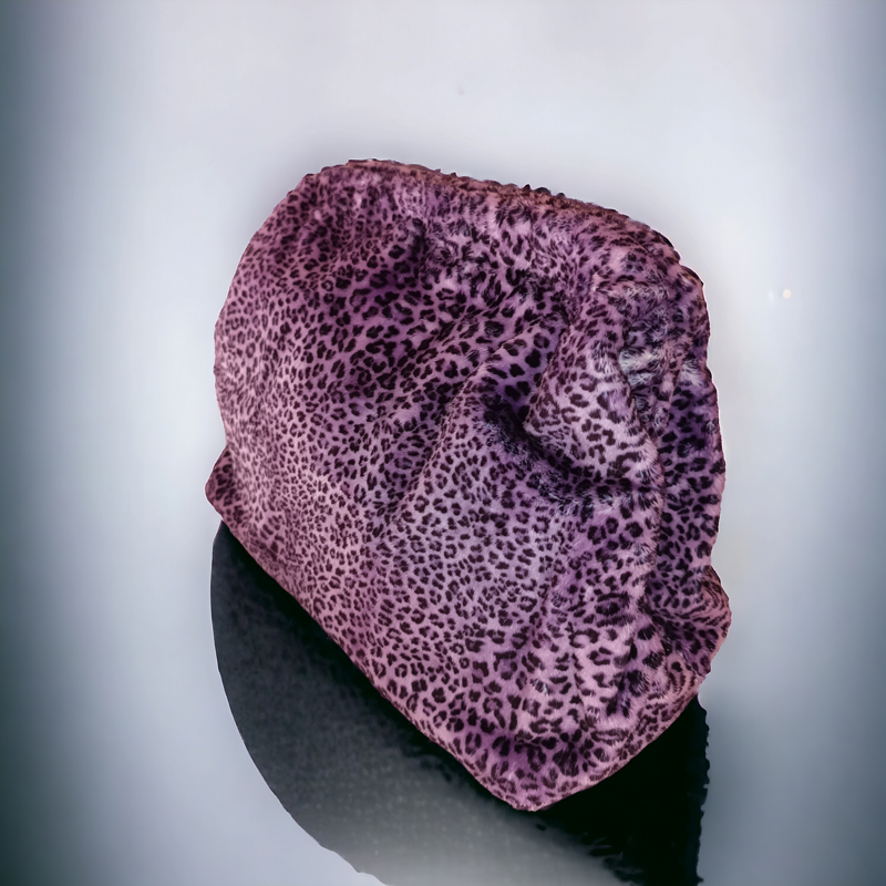 | Synthetic fur clutch bag with leopard print and leather base. |