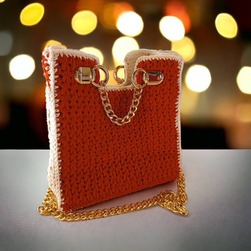 handmade crochet bag embellished with a long chain. It can be carried by hand
